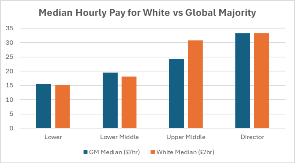 - No pay gap at this level. GM and White Directors earn the same median hourly pay. This equality is important because it reflects that we are, a people centred organisation that values fairness, inclusion, and representation